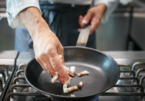 La vera carbonara si prepara con il guanciale, tagliato a listarelle e fatto cuocere senza olio finché non diventa leggermente croccante.