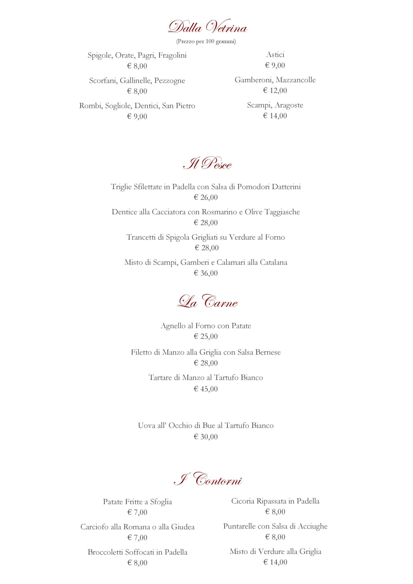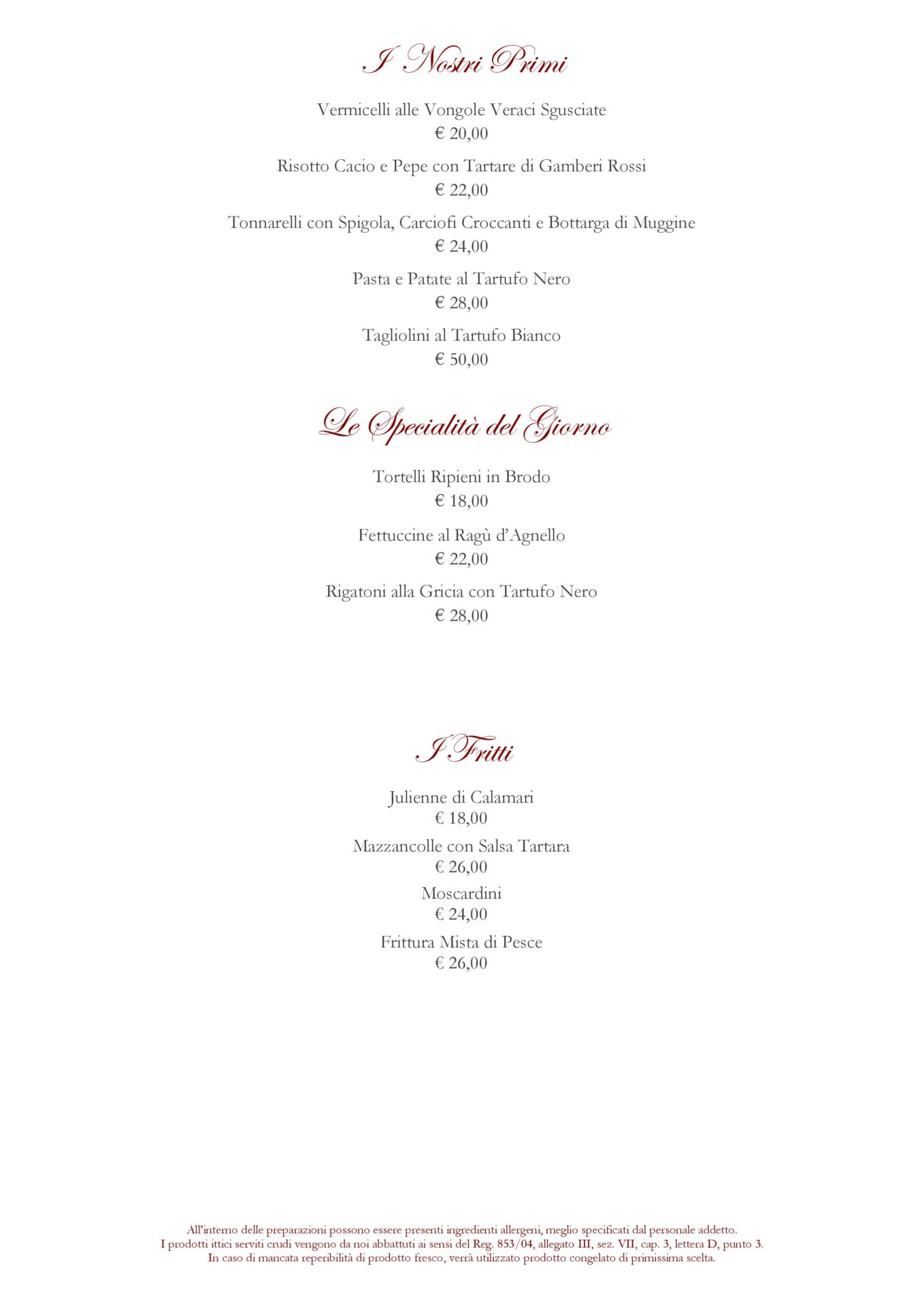 Una grande selezione di specialità di pesce, di carne e alcuni piatti del giorno, come i Tortelli ripieni in brodo, le Fettuccine al ragù d’agnello e i Rigatoni alla gricia con tartufo nero.
